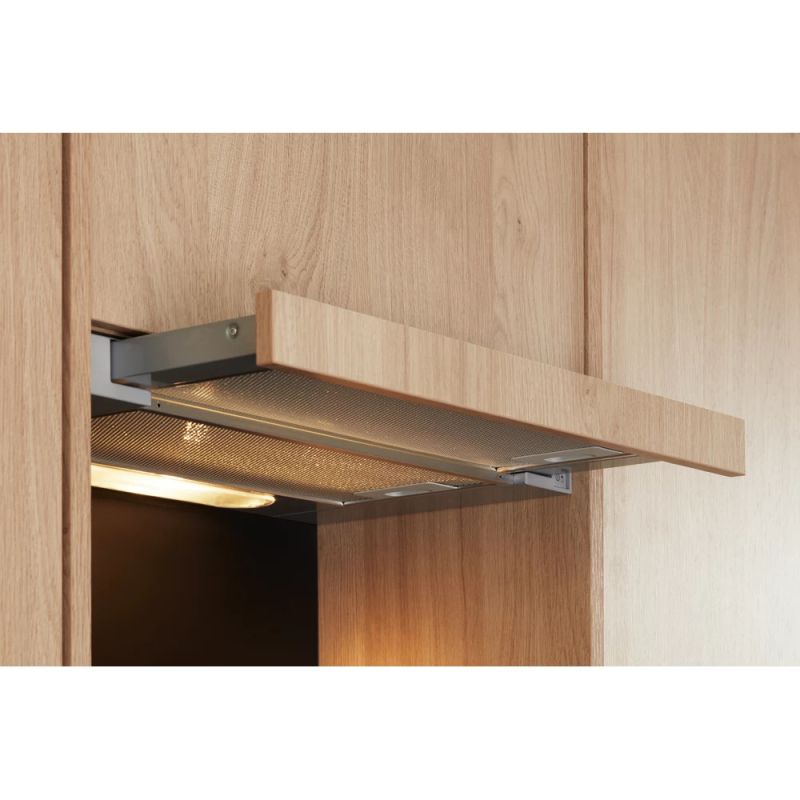 Kenmerken van deze Bauknecht geïntegreerde afzuigkap: apparaat minder dan 60 cm breed. Uitstekend afvoervermogen, zodat u geniet van een frisse, vetvrije kookomgeving. Uitwasbare aluminium vetfilters, geschikt voor de vaatwasser. LED lampen, voor de ideale verlichting. Aanpasbare afvoertechnologie. U kiest uit het installatietype met directe afvoer, of recirculatie.