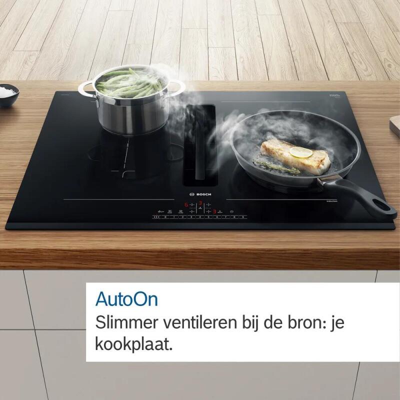 De Bosch PVQ821H26E is niet alleen gebruiksvriendelijk, maar ook uitgerust met een automatisch ventilatiesysteem. Dit systeem schakelt automatisch in zodra de kookplaat opwarmt, waardoor stoom en geuren direct bij de bron worden verwijderd. Dankzij de CombiZone-functie kun je bovendien twee inductiezones samenvoegen voor grotere pannen, wat je kookmogelijkheden verder vergroot. Het moderne ontwerp en de vlak geïntegreerde rand maken de kookplaat bovendien gemakkelijk schoon te houden.