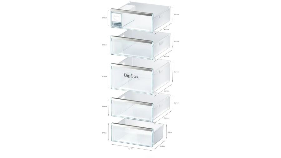 Een van de grote voordelen van de Bosch diepvries GSN58EWCV is de Vario Zone, die het mogelijk maakt om de glazen plateaus in het vriesgedeelte naar wens te verplaatsen. Hierdoor kun je eenvoudig grote diepvriesproducten opbergen of meerdere vershouddozen stapelen. De handige Big Box-lade maakt het opslaan van grotere items nog eenvoudiger.