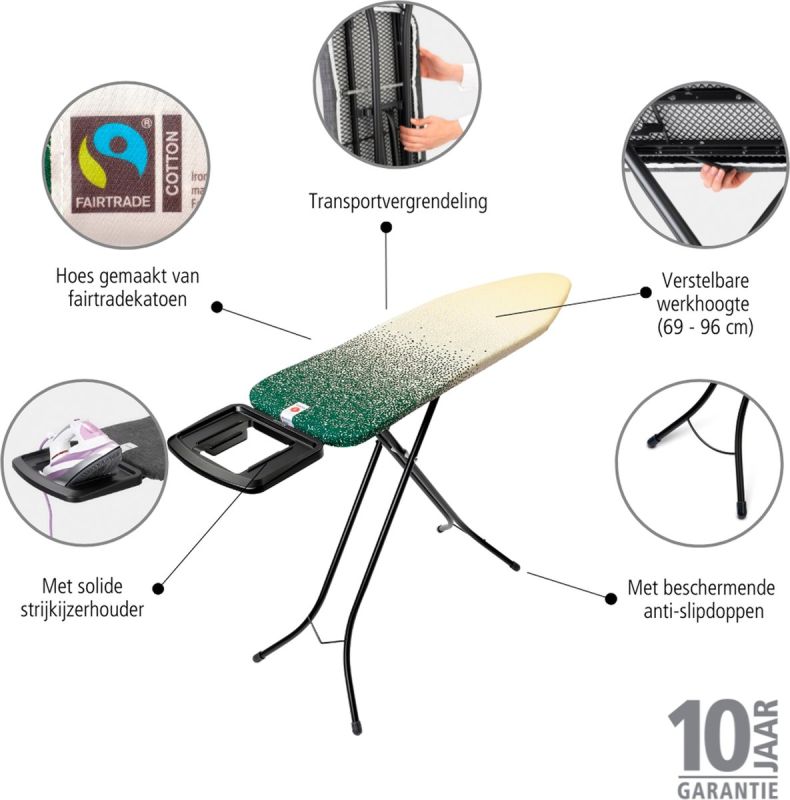 De BRABANTIA strijkplank 242083 biedt je alles wat je nodig hebt voor een efficiënte en comfortabele strijkervaring. Deze populaire strijkplank is ontworpen met oog voor gebruiksgemak en duurzaamheid. Met een hoes van 100% Fairtrade katoen ben je niet alleen goed bezig voor jezelf, maar ook voor de wereld om je heen. Dankzij het stevige en stabiele frame, dat is uitgerust met vier poten, kun je strijken zonder dat de plank wiebelt, wat zorgt voor een betere werkhouding en minder belasting van je rug.