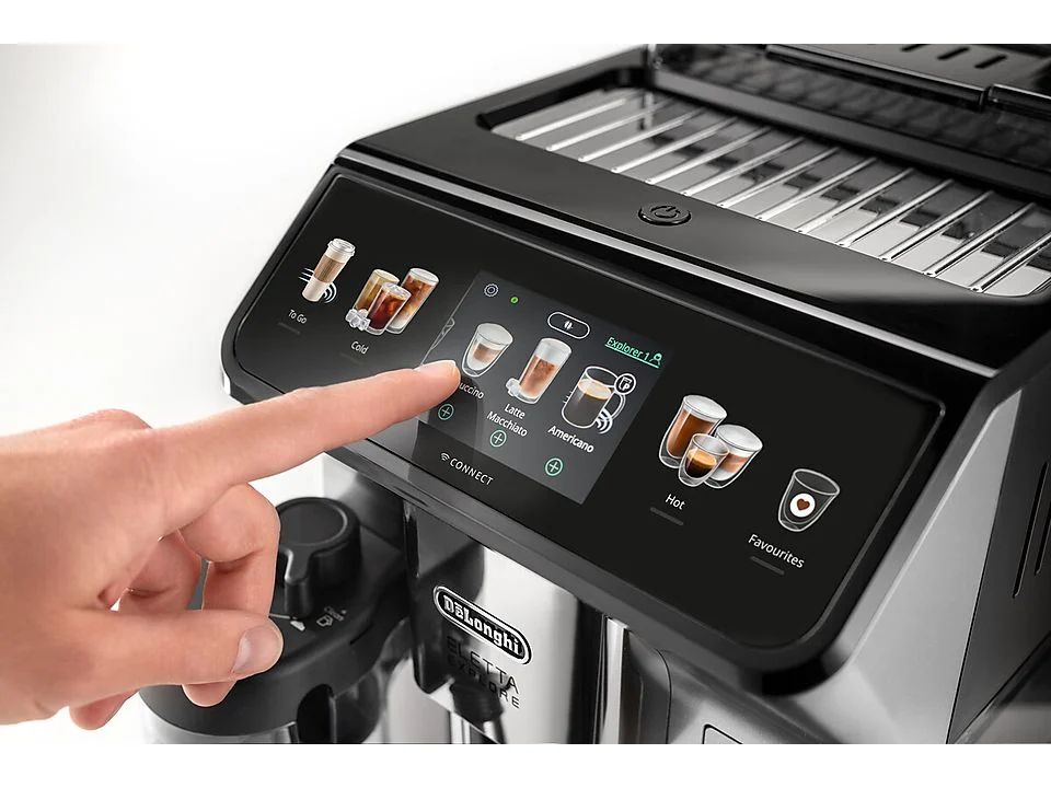 De´Longhi volautomatische koffiemachine bonen ECAM450.65.S Eletta Explore is eenvoudig in gebruik. Met het intuïtieve touchscreen bedien je de machine snel en eenvoudig. Hierdoor kun je jouw favoriete koffiedrank met gemak bereiden. Dankzij de geïntegreerde melkopschuimer maak je mooie melkschuim creaties zoals een perfecte latte macchiato of een romige cappuccino, helemaal naar jouw wens.