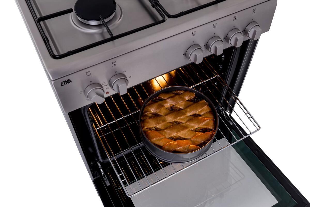 De oven van het Etna gasfornuis met oven FGV160RVS heeft een temperatuur bereik van 50 tot 270 ºC, wat zorgt voor een veelzijdige kookervaring. Je kunt kiezen uit verschillende ovenfuncties die jou in staat stellen om gerechten perfect te bereiden. Of je nu de grillfunctie wilt gebruiken om een heerlijke korst te creëren of de traditionele onder- en bovenwarmte om je gerechten gelijkmatig te garen, dit fornuis levert het allemaal.