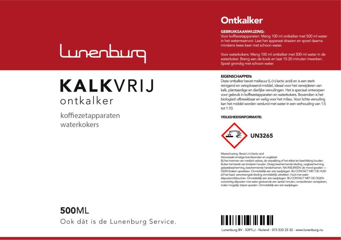 Lunenburg Kalkvrij Ontkalker (500ml) is speciaal ontwikkeld om kalkaanslag effectief te verwijderen uit koffiezetapparaten en waterkokers, waardoor de levensduur van je apparaten wordt verlengd en hun prestaties worden geoptimaliseerd.