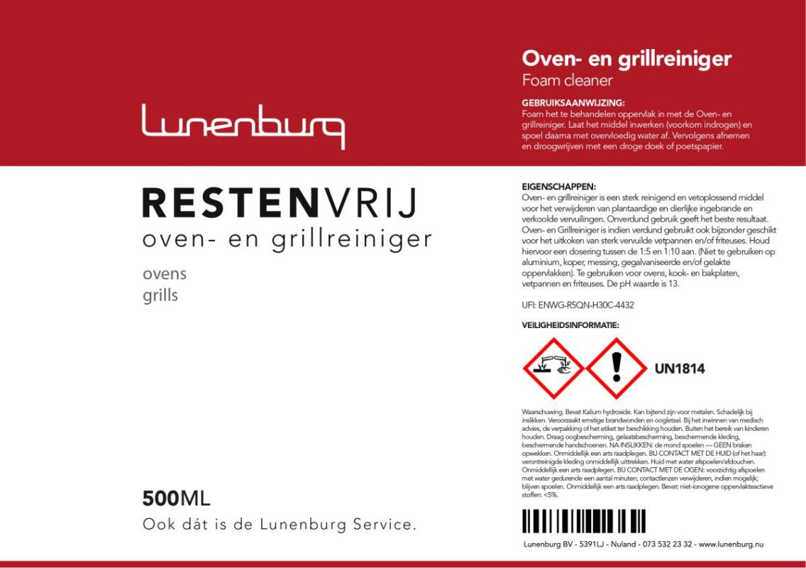 Lunenburg Restenvrij Oven- en Grillreiniger (500ml) is een krachtige reiniger, ideaal voor het grondig schoonmaken van ovens en grills. Het verwijdert hardnekkige etensresten, vet en aangebrande vlekken, zodat je keukenapparatuur er weer als nieuw uitziet.
