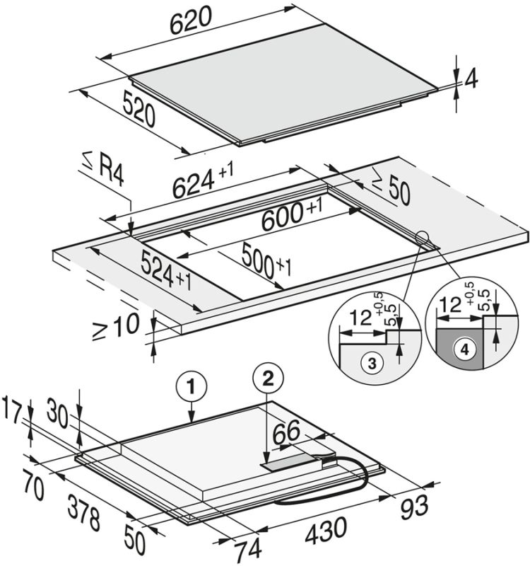 - In 620 mm breed voor integratie in of plaatsing op het werkblad