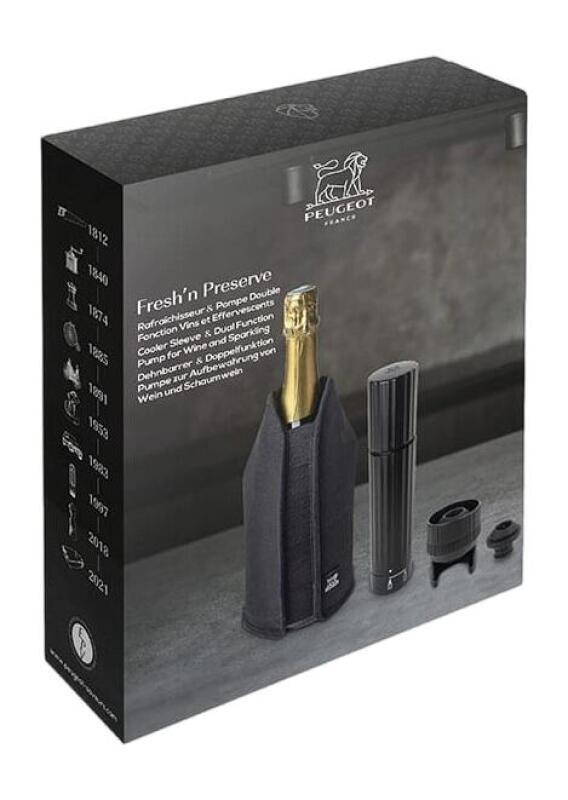 De Peugeot Fresh'n Preserve Geschenkverpakking bevat twee innovatieve accessoires die de kwaliteit en smaak van jouw wijn en mousserende wijn helpen behouden. Met de combinatie van de Frizz uitschuifbare wijn- en champagnekoeler en de Preserve Duo bewaar pomp geniet je van de optimale frisheid, zelfs na het openen van een fles. Dit is de ideale oplossing voor wijnliefhebbers die hun dranken willen serveren op de perfecte temperatuur en met een behoud van bubbels.