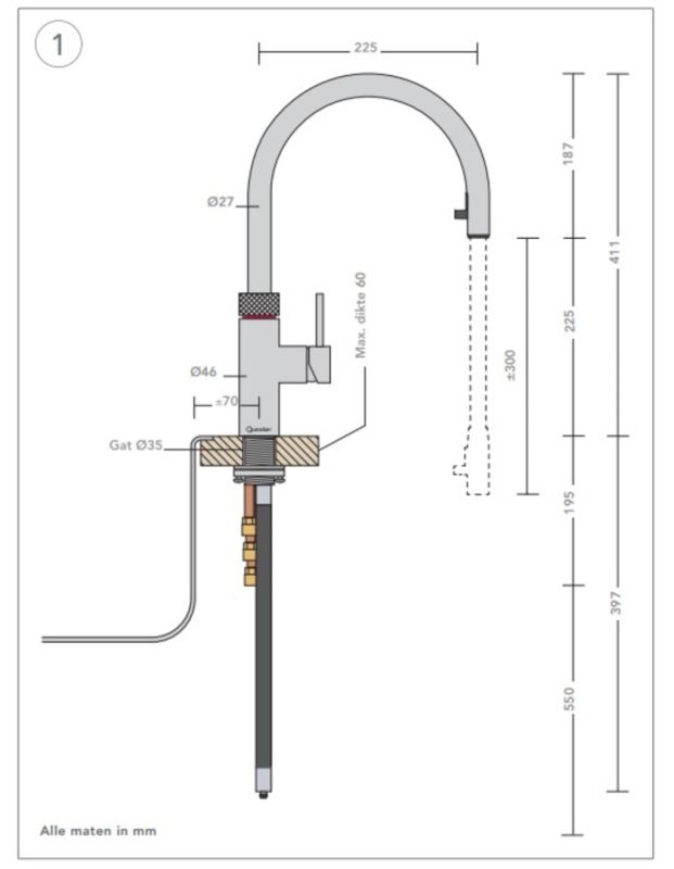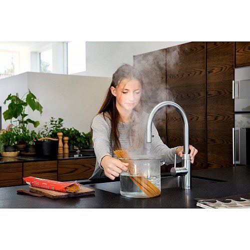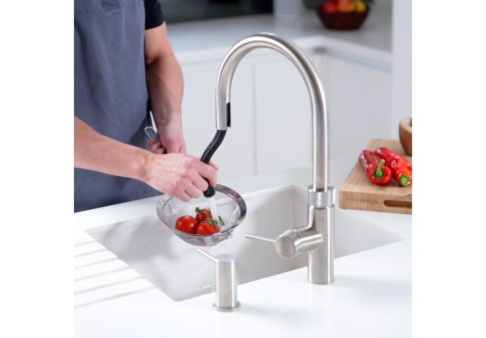 Koud, warm en kokend water uit één kraan, met uittrekslang voor extra bereik in de spoelbak