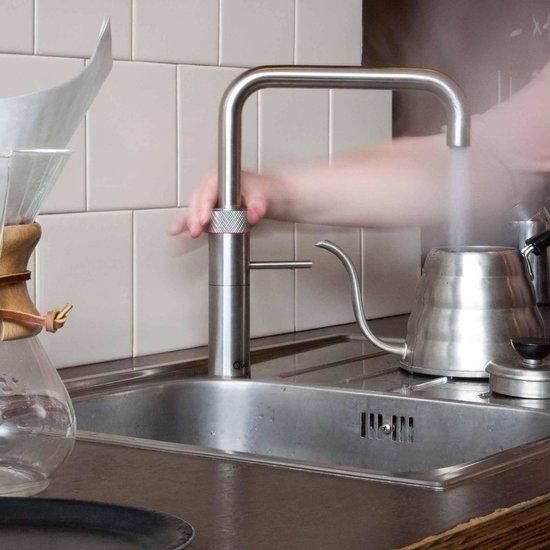 Kokendwaterkraan en mengkraan in één, met rechte uitloop.