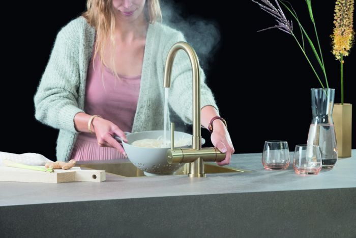 Deze 3-in-1 kraan heeft een veilige druk draai bediening voor kokend water. De rechter hendel geeft koud en warm water. Door het waterbesparende binnenwerk en de ecostart functie is er minder water en energie verspilling.