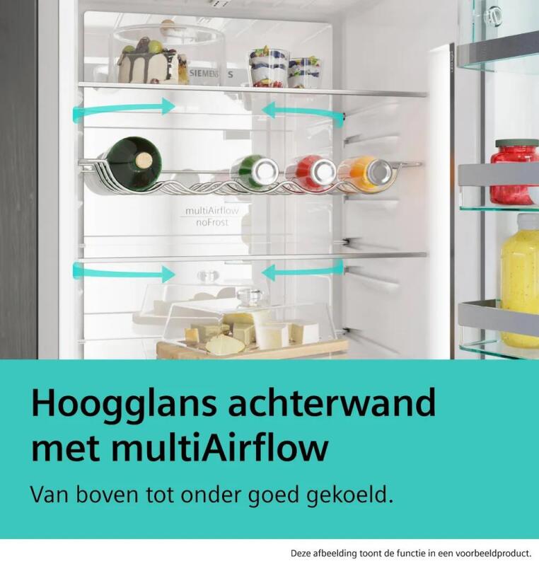 Met het multiAirflow systeem wordt de lucht gelijkmatig in de koelkast verspreid, zodat alles, van je meest kwetsbare producten tot je drankjes, efficiënt gekoeld blijft. De superKoelen functie stelt je in staat om verse producten snel af te koelen, waardoor je geen verlies van smaak of kwaliteit ervaart. Daarnaast vind je praktische accenten zoals een flessenrek, dat het opslaan en bereiken van je favoriete dranken vergemakkelijkt.