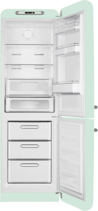 De Smeg koelvriescombinatie FAB32RPG5 is een prachtig voorbeeld van retro design gecombineerd met moderne technologie. Deze vrijstaande koelkast biedt niet alleen voldoende ruimte voor al je etenswaren, maar ook een stijlvol element in jouw keuken. Het watergroene kleurenschema en de ronde vormen maken het een echte eyecatcher. Met de Total No Frost technologie hoef je je geen zorgen te maken over ijsvorming in het vriesvak, waardoor je meer ruimte hebt voor je favoriete producten. Deze koel-vriescombinatie is perfect voor gezinnen en iedereen die graag georganiseerd blijft in de keuken.