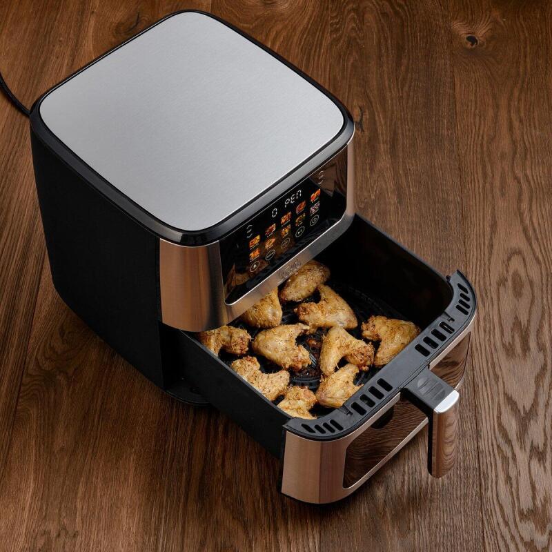 De Solis 8200 Air Fry & Dry XL is ontworpen om het koken eenvoudig en plezierig te maken. Met een capaciteit van 7,5 liter is er voldoende ruimte om maaltijden voor het hele gezin te bereiden. Het aanraakdisplay maakt het instellen van de temperatuur en tijd een fluitje van een cent. Je kunt de temperatuur instellen van 40 °C tot 230 °C, wat je de flexibiliteit biedt om verschillende gerechten te bereiden.