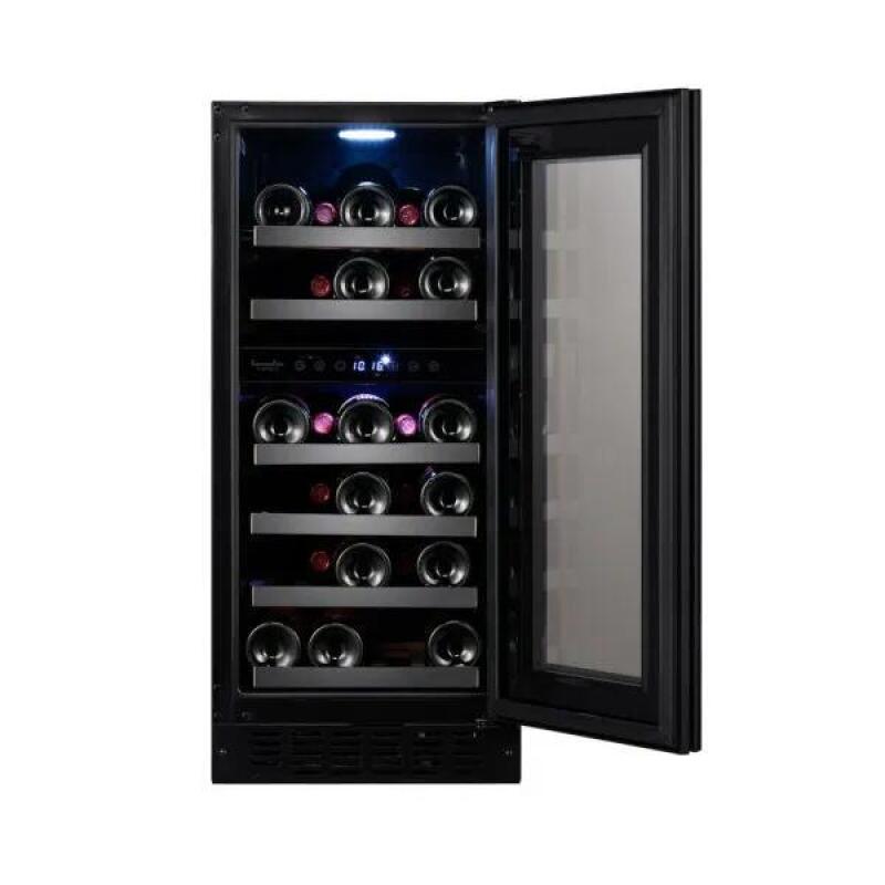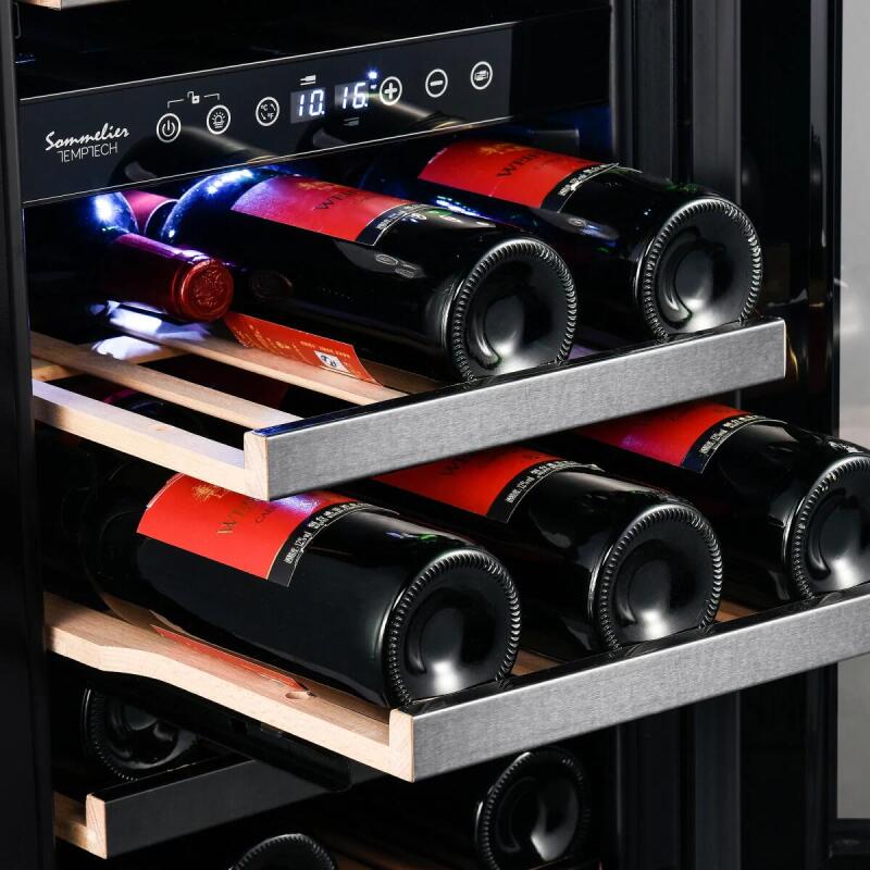 De wijnkasten “Sommelier by Temptech” hebben een modern exclusief design met zwart glas vooraan en zwarte details op de planken. De wijnkasten worden geleverd met 2 temperatuurzones (5-12 ° C en 12-20 ° C). Beide zones zijn individueel regelbaar, dit zorgt ervoor dat je altijd de wijn klaar hebt staan om te serveren.