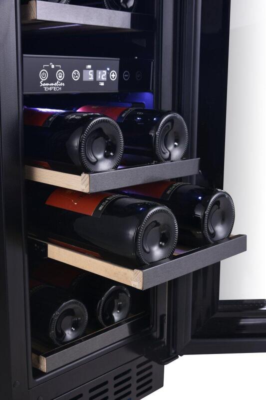 Beide zones zijn eenvoudig apart in te stellen via het digitale bedieningspaneel. Uw wijnflessen worden horizontaal geplaatst op de houten lades, wat niet alleen mooi oogt, maar ook goed is voor de rijping van de wijn.