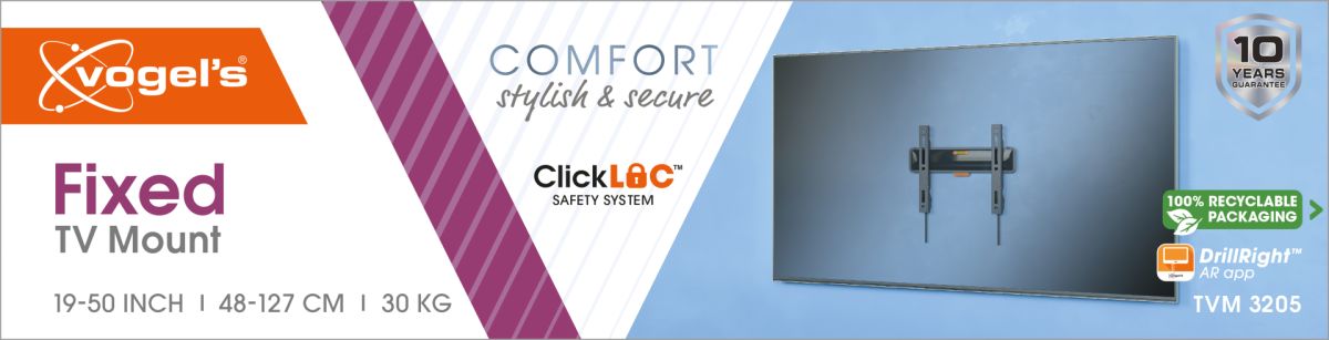 De COMFORT Tilt tv beugel is uitgerust met het unieke ClickLoc™ veiligheidssysteem. Dankzij dit systeem kun je je tv eenvoudig vergrendelen of losmaken van de beugel. Door de hoorbare klik weet je zeker dat je tv veilig vergrendeld is. Zachte patches op de tv beugel beschermen de achterkant van je tv bij het bevestigen.
