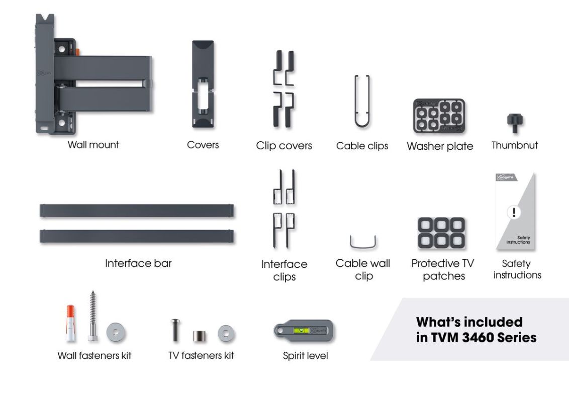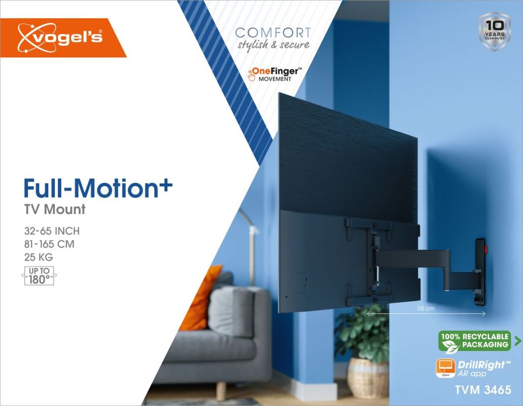 Om de COMFORT Full-Motion+ tv beugel te installeren, hoef je geen professional te zijn. Een boormal, schroeven, fischer® DuoPower pluggen, kabelbinders en een waterpas zijn bijgesloten. Het eerste boorgat bepaal je eenvoudig met onze gratis DrillRight™ AR App.