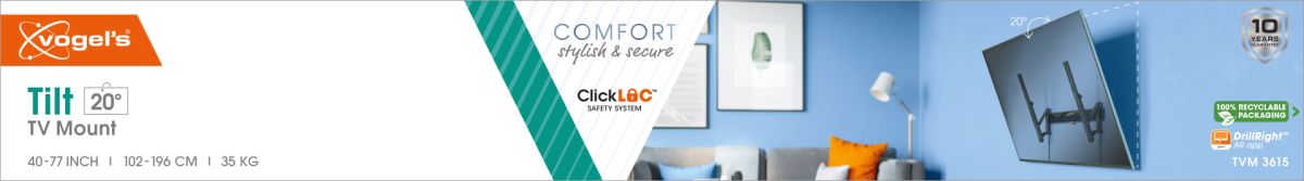 De COMFORT Tilt tv beugel is voorzien van het unieke ClickLoc™ veiligheidssysteem. Dankzij dit systeem vergrendel je je tv met een hoorbare klik eenvoudig en veilig aan de beugel. Daarnaast zijn deze tv beugels zijn getest tot maar liefst driemaal het maximale gewicht. Zachte patches op de beugel voorkomen dat je de achterkant van je tv bekrast tijdens het monteren.