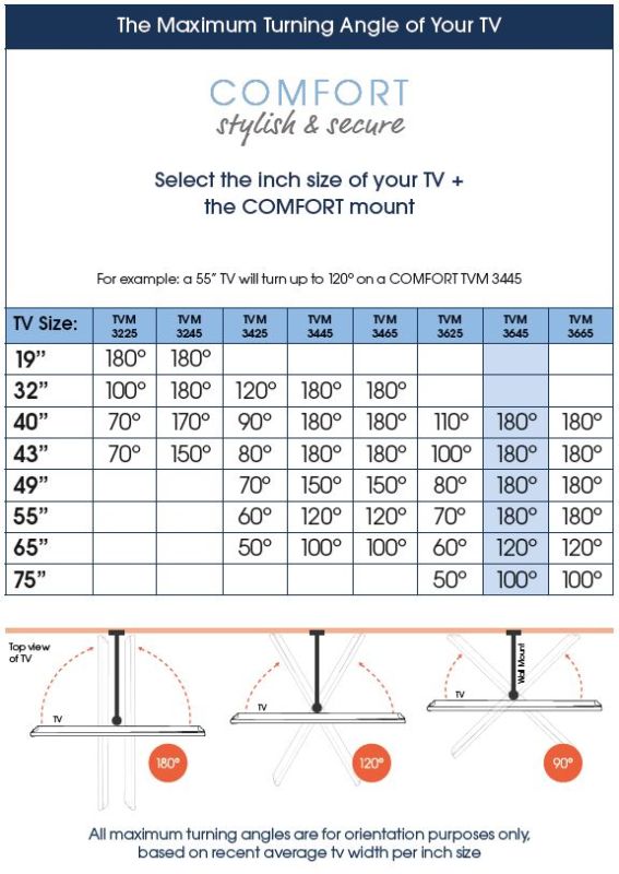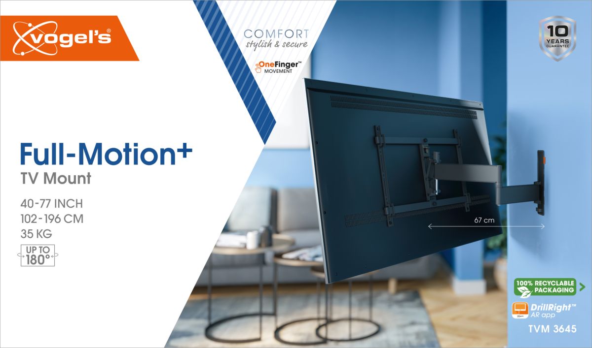 Je tv in de gewenste kijkhoek te positioneren is ongekend makkelijk. De COMFORT Full-Motion+ tv beugel beschikt namelijk over Vogel’s uniek One-Finger™ Movement technologie. Hierdoor scharniert de beugel zeer licht en soepel. Dankzij de extreem lange armen kan je je tv ver draaien. Wil je weten hoeveel graden precies? Vul op deze pagina jouw tv-type in en zie direct de werkelijke draaihoek van jouw tv.