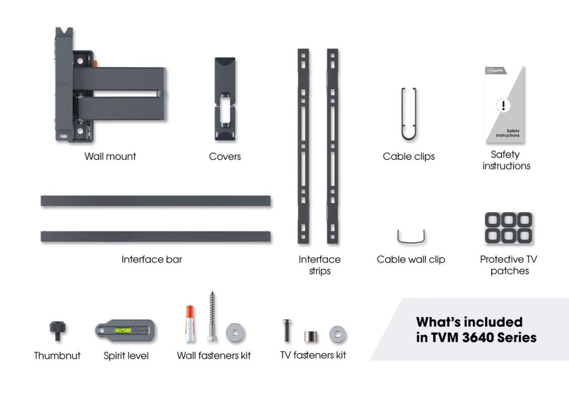 De COMFORT Full-Motion+ tv beugel is eenvoudig te installeren. Zo worden een boormal, schroeven, fischer® DuoPower pluggen, kabelbinders en een waterpas meegeleverd. Het eerste boorgat teken je eenvoudig af met onze gratis DrillRight™ AR App. Hangt je tv een tikje scheef? Geen probleem. Ook na installatie hang je hem nog eenvoudig waterpas.