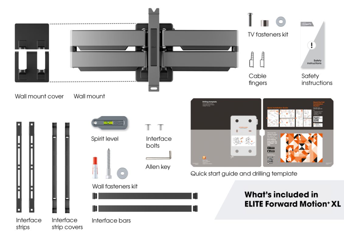 De ELITE Forward Motion tv-beugel is eenvoudig te installeren; een Quick Install Guide wordt meegeleverd en een gedetailleerde handleiding en installatievideo zijn online te vinden. Alle benodigde materialen voor montage zijn eveneens bijgesloten: een waterpas, boormal, extra brede muurplaat, schroeven en Fischer® DuoPower pluggen. Met de gratis DrillRight™ AR App teken je eenvoudig je eerste boorgat af. Geruststellend detail: de tv beugel is voorzien van zachte patches die voorkomen dat je de achterzijde van je tv beschadigt tijdens het installeren. Op de ELITE Forward Motion tv-beugel krijg je maar liefst 15 jaar garantie.